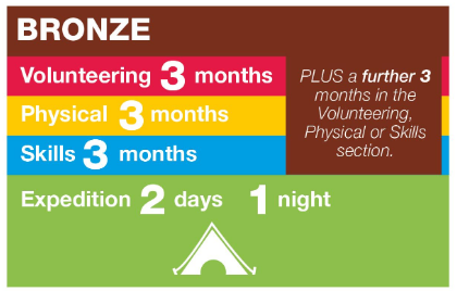 The award at the Bronze level comprises 4 sections: Volunteering, Physical, Skills and Expedition. Details of the timescales are shown in the table below.