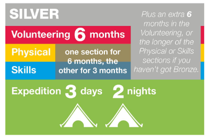 Students are able to take part in Silver D of E as a direct entrant (having not completed Bronze) or following on from completing Bronze. The award at the Silver level comprises four sections: Volunteering, Physical, Skills and Expedition. Details of the timescales are shown in the table below.