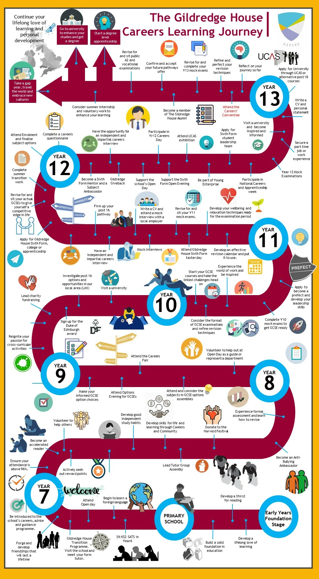 The Careers Education programme at Gildredge House helps students make the most of themselves and their opportunities. In particular, it aims to help students: maintain a culture of high aspirations; develop their knowledge and understanding of the changing nature of work; learning and careers; develop the skills and attitudes necessary for success in modern Britain; develop in students an awareness of the wide variety of education, training and careers opportunities both locally and nationally; extend their understanding of opportunities in learning and work; develop an awareness of the range of opportunities which are realistically available to them in continued education and training at 16+ and 18+; assess their achievements, qualities and skills; develop the necessary decision-making skills to manage transitions; experience the world of work and develop transferable skills; make good use of information and guidance by all members of staff at Gildredge House; recognise and deal accordingly with influences on their attitudes, values and behaviour in relation to work; develop and use their self-knowledge when thinking about course choices; recognise the value and impact their activities at school can have on their future; and develop and use the skills they need to review achievements, plan future actions, make decisions, present themselves well and cope with change and transition.